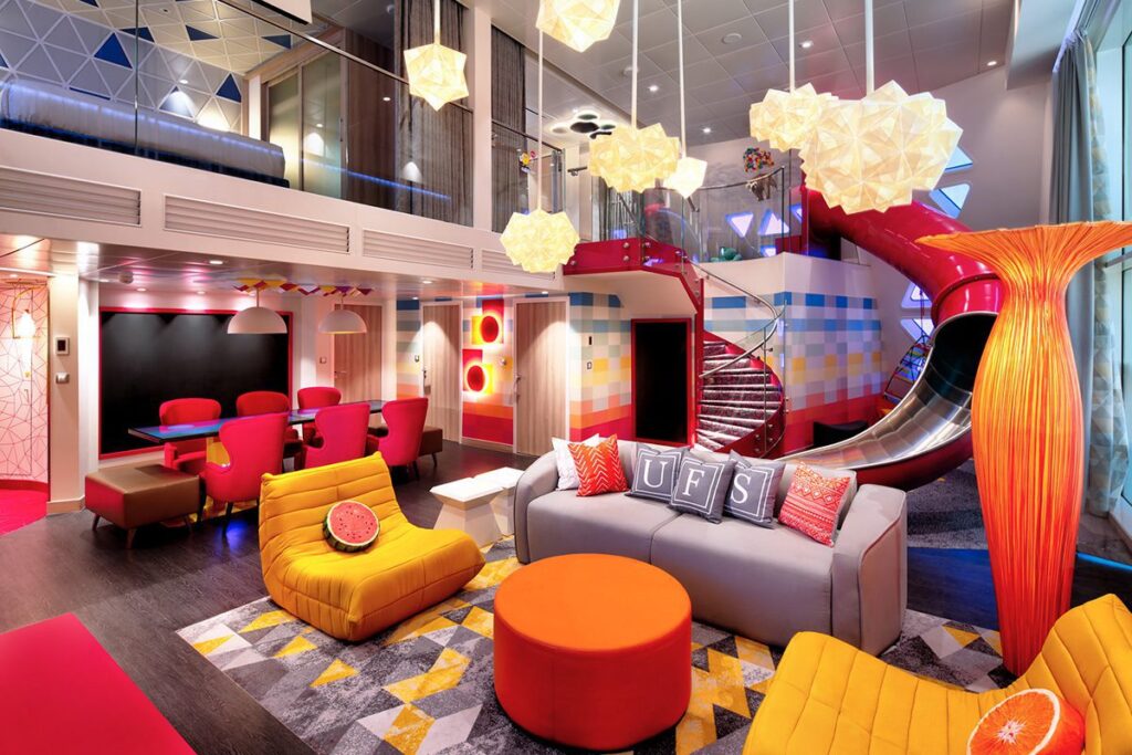 Why? Royal Caribbean took family accommodation to soaring new heights on Symphony of the Seas, Spectrum of the Seas, and now the world’s largest cruise ship Wonder of the Seas. Sleeping up to eight, the jaw-dropping suite decorated in eye-popping neon colours has a slide between floors, piano stairs, gaming table, giant TV, Lego wall and table tennis on the balcony. Novel kid-centric features in the 1,134-square-foot play palace include a small porthole that youngsters can crawl through to reach their bedroom.